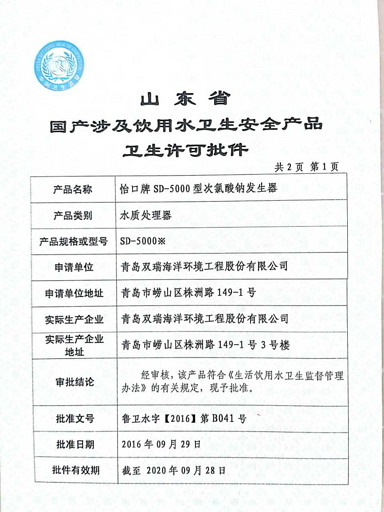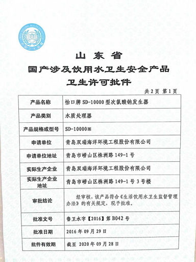 青島雙瑞公司飲用水消毒裝置獲山東省衛生許可批件