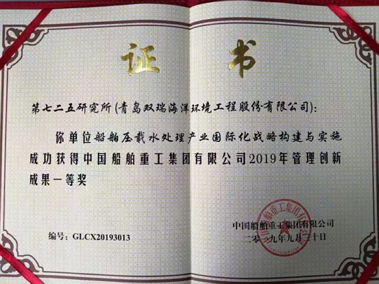 近日,青島雙瑞公司接到中國船舶重工集團有限公司通知,公司申報的管理創新成果《船舶壓載水處理產業國際化戰略構建與實施》,榮獲集團公司管理創新成果一等獎。青島雙瑞公司首次獲此殊榮。