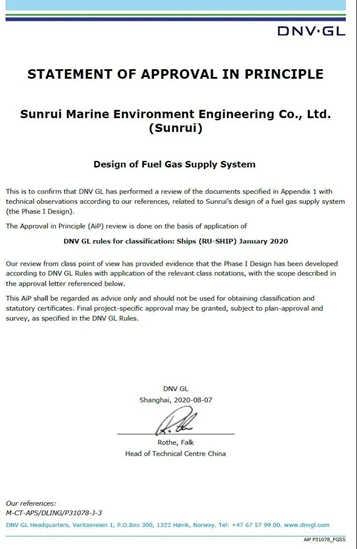 繼6月獲得LR船級社原理認可(AIP)證書后,青島雙瑞公司自主研發設計的船用LNG供氣系統(FGSS)再獲DNV GL船級社AIP證書,標志著該產品在系統原理和安全可靠性設計方面完全滿足IGF規則和DNV GL規范要求。